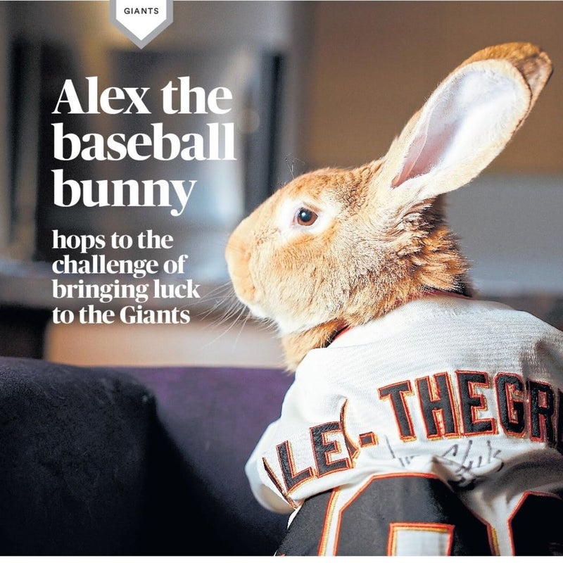 Alex the Great, a 30-pound Flemish Giant rabbit, is a well-known figure with an impressive portfolio of activities and achievements. As a brand ambassador, Alex collaborates with Purple Mattress, Psycho Bunny apparel, and other brands such as Pup lids, where he models various products. Additionally, he has starred in commercials for several companies, showcasing his appeal as a versatile model. Alex has attended over 200 events, ranging from appearances at San Francisco Giants games as the “Rally Rabbit” to uplifting community events like hospital visits and fundraisers.